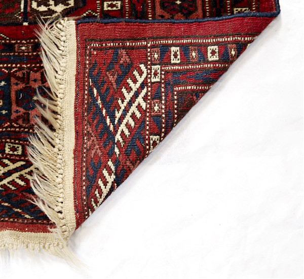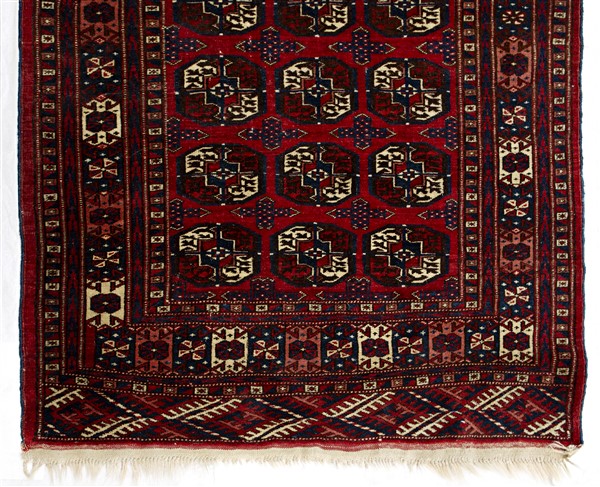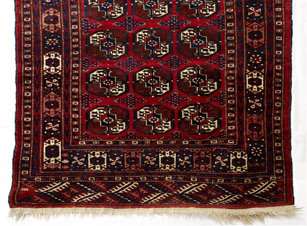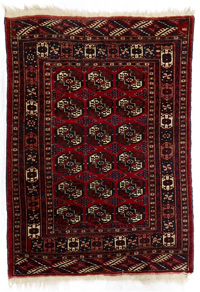 Tappeto Boukhara, Turkestan occidentale, secolo XX. Decoro con tre file di Gül su fondo rosso (cm 148x112) (difetti)