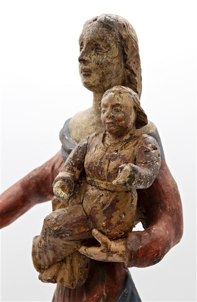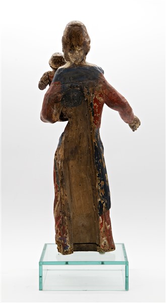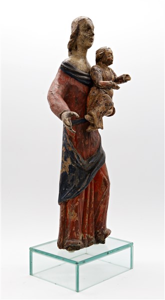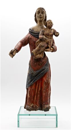 Scultore del secolo XVIII, Madonna con Bambino, legno intagliato e dipinto; base in vetro d'epoca successiva (h totale cm 61) (difetti e mancanze)