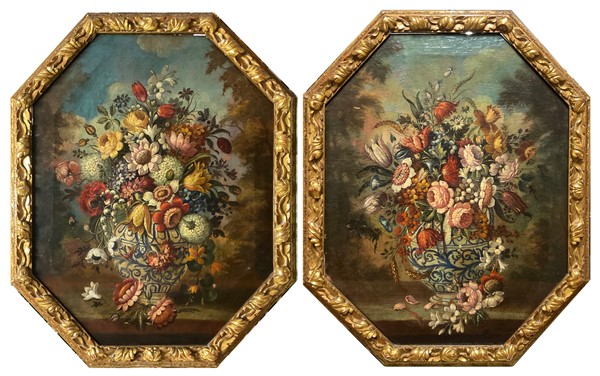 Coppia di dipinti ad olio su tela ottagonali raffiguranti "Vasi di fiori"