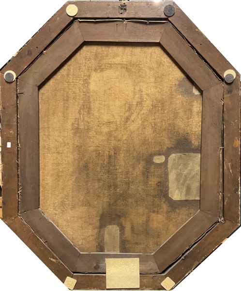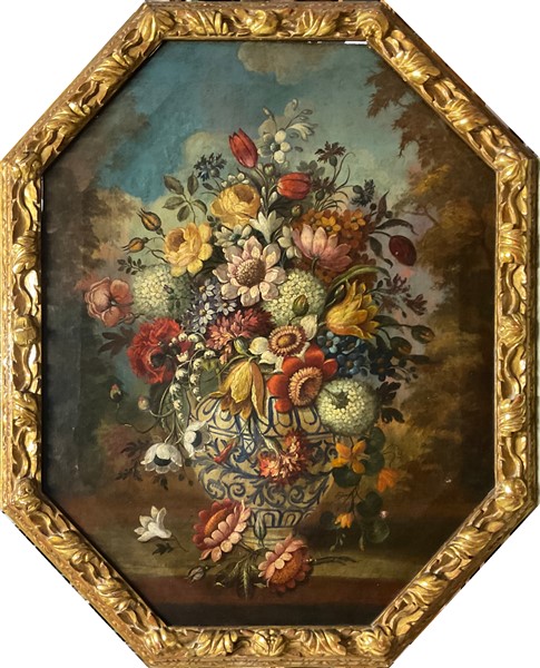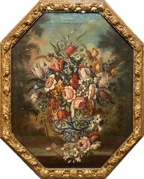 Ignoto Coppia di dipinti ad olio su tela ottagonali raffiguranti "Vasi di fior