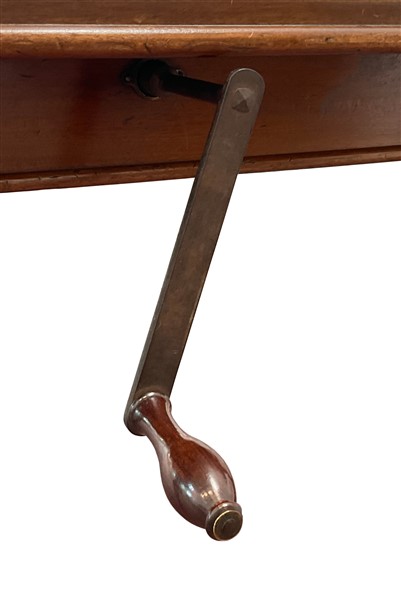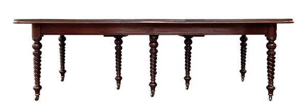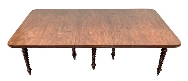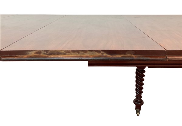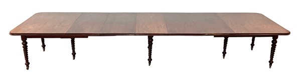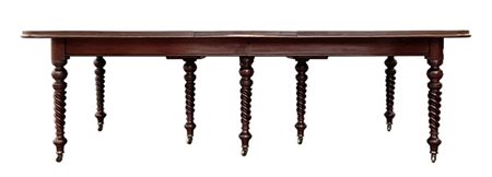 Joseph Fitter- Patent-Britiannia Works Cheapside, Birmingham, secolo XIX. Tavolo in mogano allungabile a manovella con otto gambe a torchon su rotelle, piano con angoli arrotondati. (chiuso con un allungo cm 242x75x139), dotato di cinque allunghi (cm tot 463x75x139) (difetti)