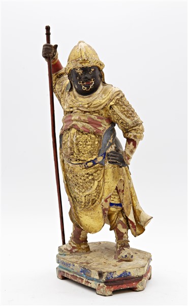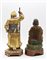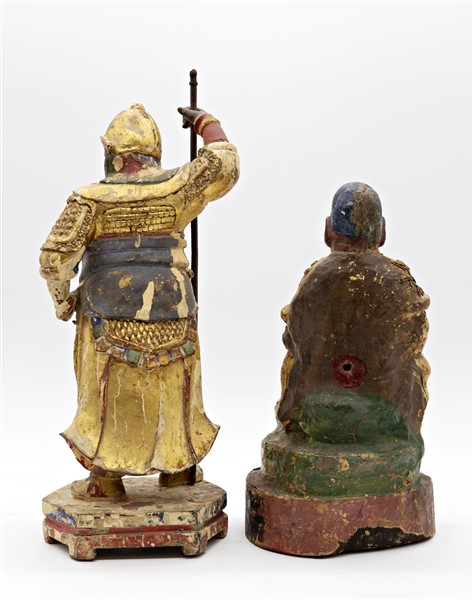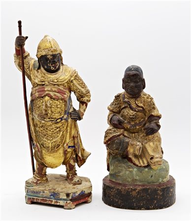 Lotto composto da un guerriero e un dignitario assiso in legno intagliato, dipinto e dorato. Cina, secolo XIX (h max cm 39) (difetti e mancanze)