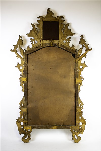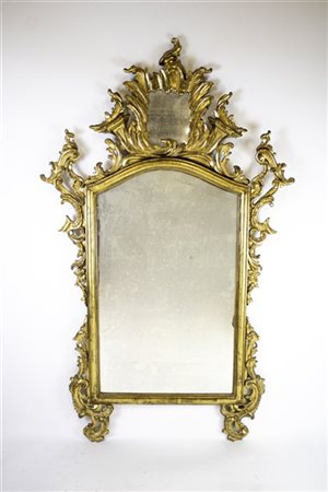 Specchiera in legno intagliato e dorato con cimasa e fregi a volute e motivi rocaille. Secolo XIX (cm 167x101) (difetti)