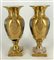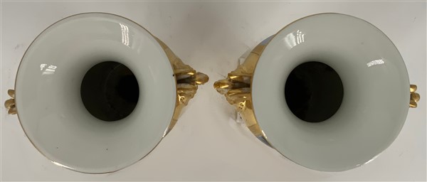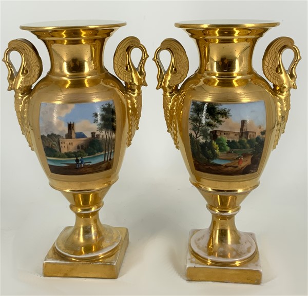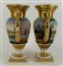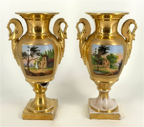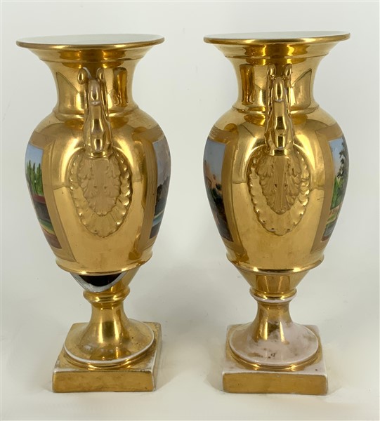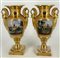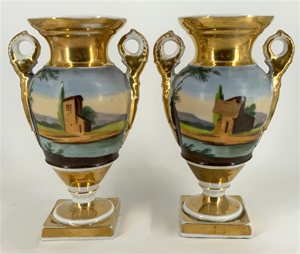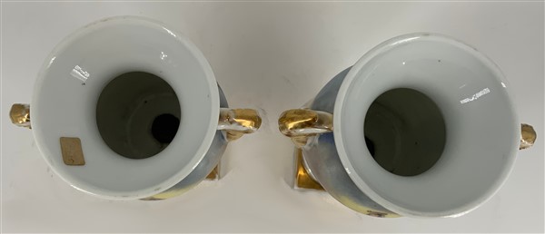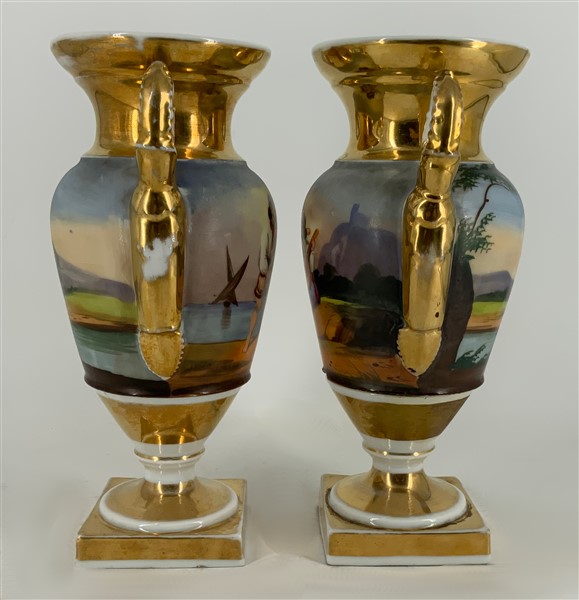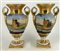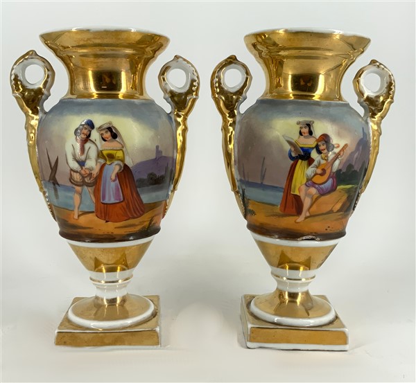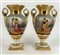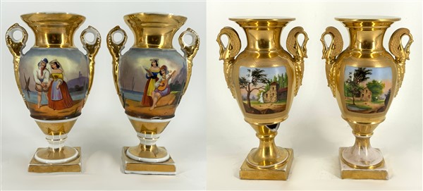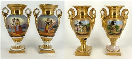 Manifattura del secolo XIX. Due coppie di vasi biansati in porcellana dipinti in policromia a figure e paesaggio, profili in oro (h max cm 24,5) (difetti ed uno con mancanza)