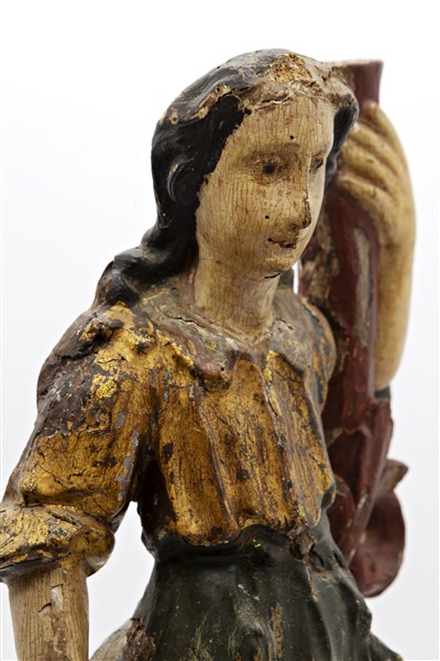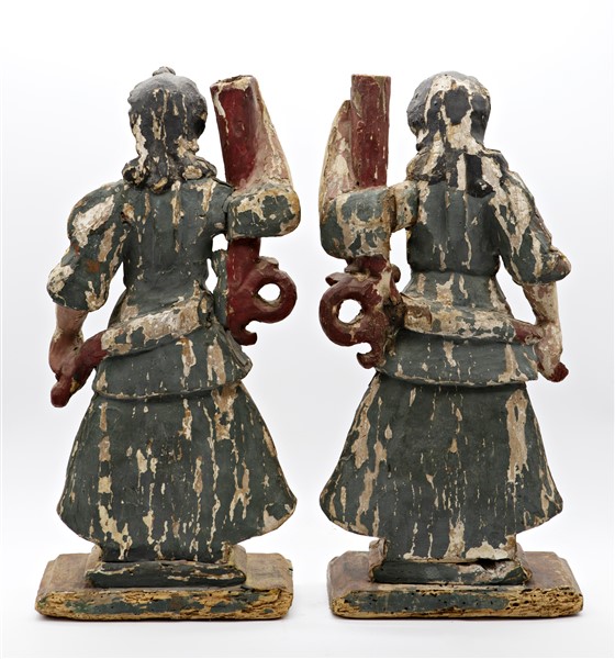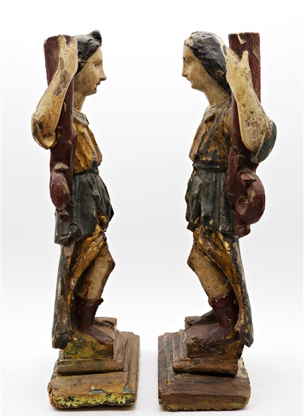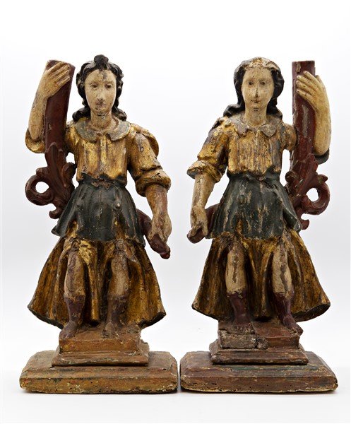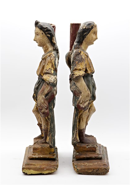 Scultore del secolo XVII. Coppia di angeli reggicero in legno intagliato, dipin
