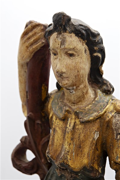 Scultore del secolo XVII. Coppia di angeli reggicero in legno intagliato, dipinto e dorato (h cm 53) (difetti e mancanze)