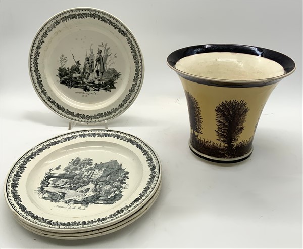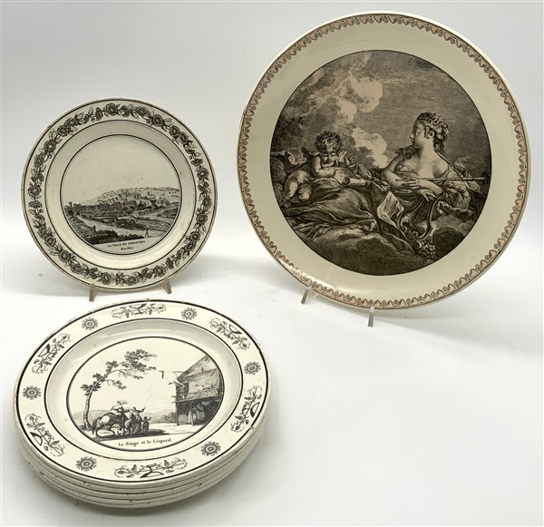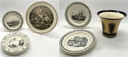 Manifatture francesi, secolo XIX-XX. Lotto composto da numerosi diversi piatti e un vaso in terraglia decorata in monocromia a figure e paesaggio (d max cm 30) (difetti)