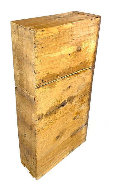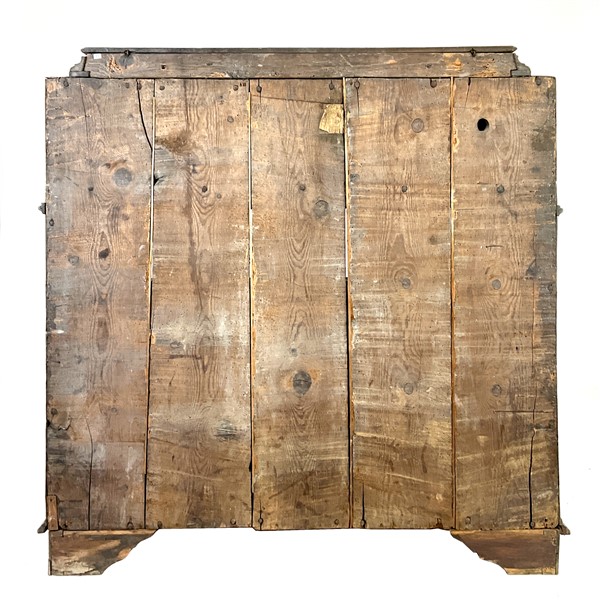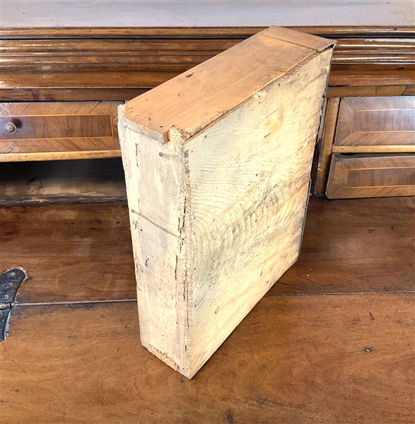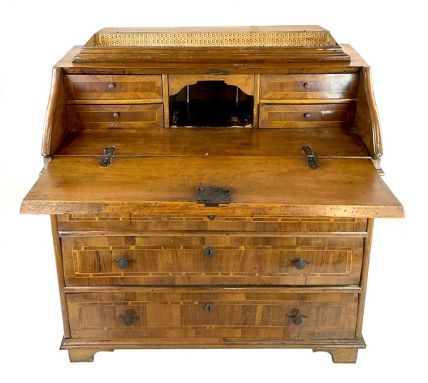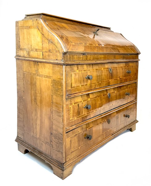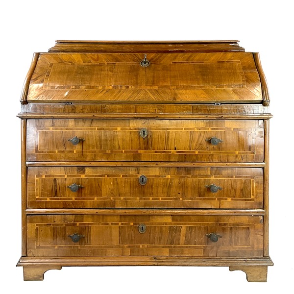 Ribalta lastronata in noce e filettata in legni vari, fronte a tre cassetti e calatoia celante quattro tiretti e vani a giorno, parte superiore con pianetto ribaltabile. Fine secolo XVIII (cm 114x115x55) (difetti e restauri)