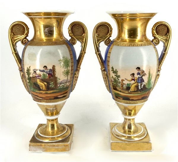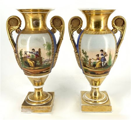 Manifattura del secolo XIX. Coppia di vasi biansati in porcellana dipinta in po