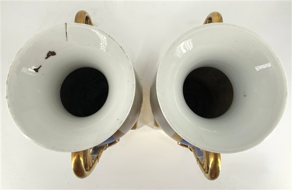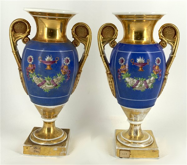 Manifattura del secolo XIX. Coppia di vasi biansati in porcellana dipinta in policromia a figure e festoni entro riserva su fondo blu ed oro (h cm 30). Etichetta sul fondo (difetti)