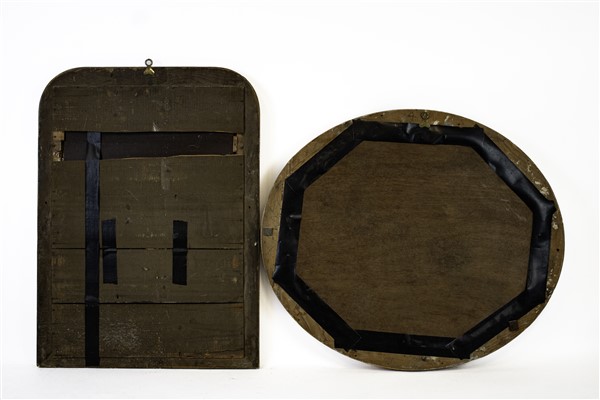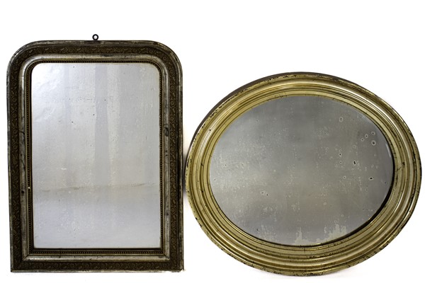Lotto composto da una specchiera con cornice in legno e pastiglia argentata (cm 80x59), e una specchiera ovale in legno dorato a mecca (cm 81x69) (difetti)