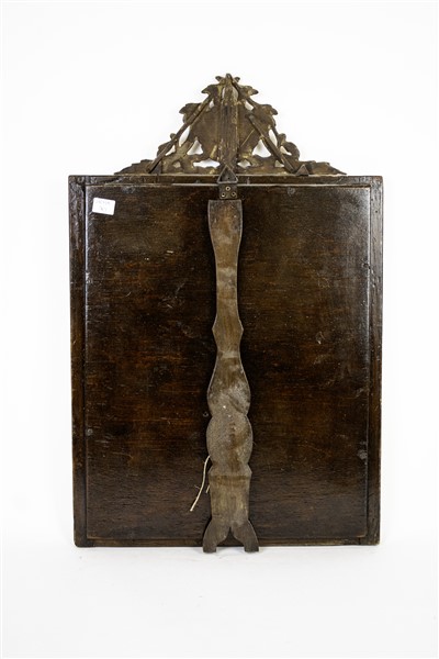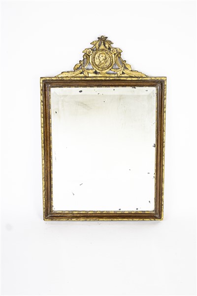 Specchiera con cornice in legno dipinto e dorato con cimasa traforata sormontata da medaglione con profilo tra foglie e fiori. Veneto, secolo XVIII. Adattata a specchiera d'appoggio (cm 42x60) (difetti)