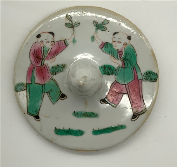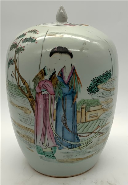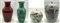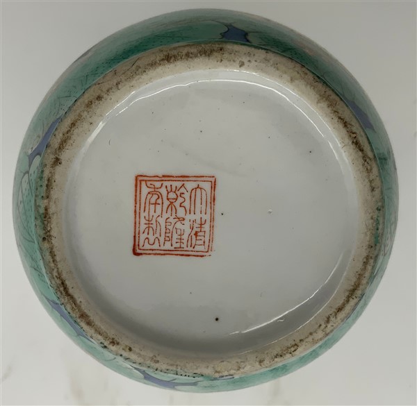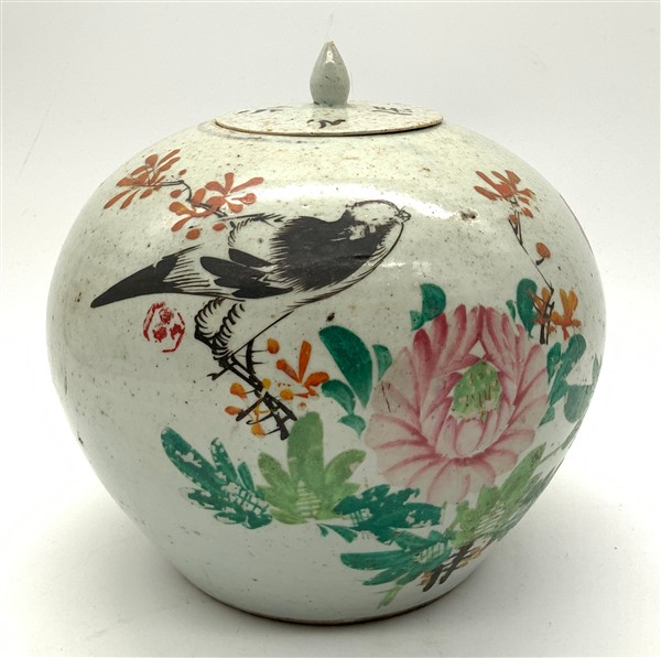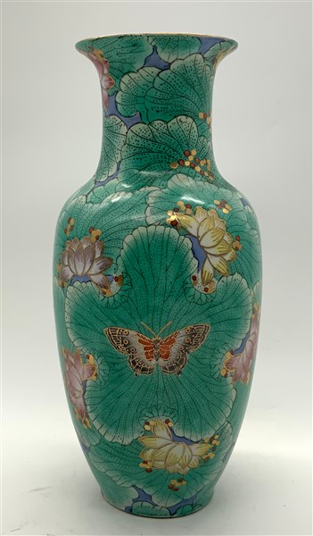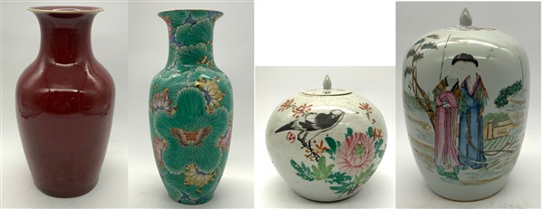Lotto composto da due potiche con coperchio, un vaso sangue di bue e un vaso verde con farfalle. Cina, secolo XIX-XX (h max cm 36) (difetti e restauri)