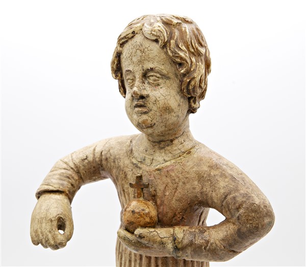 Scultore del secolo XVIII, Salvator Mundi, legno intagliato e laccato (h cm 55) (difetti e restauri)