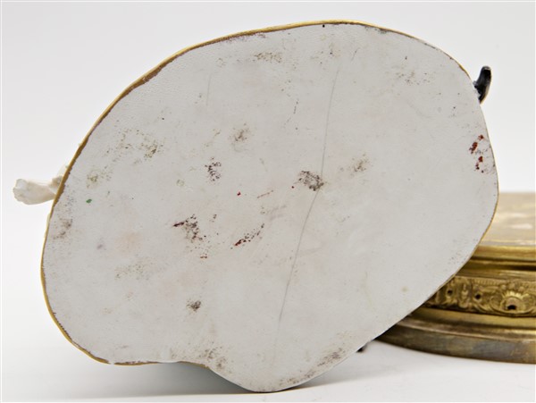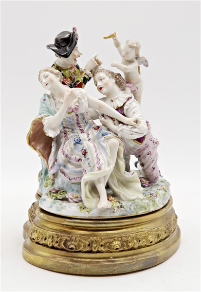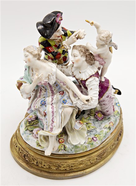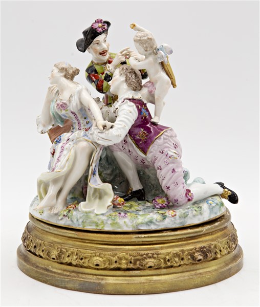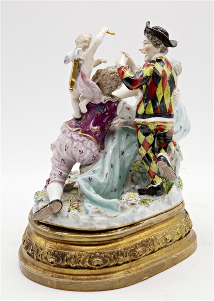 Manifattura tedesca, da un modello di Meissen "L'amante impetuoso" di J.J. Kaendler. Gruppo in porcellana dipinta in policromia a scena galante e Arlecchino (h cm 18,5) base sagomata in legno dorato (h tot cm 22) (difetti e restauri)