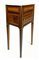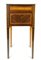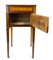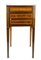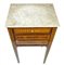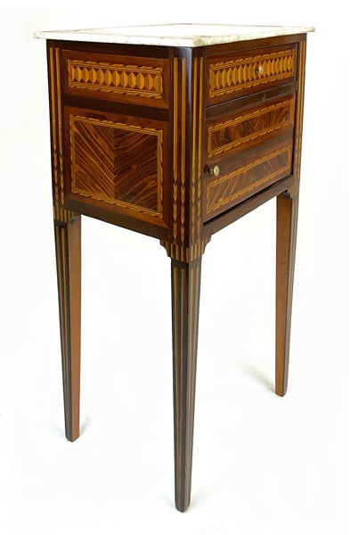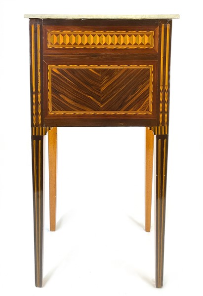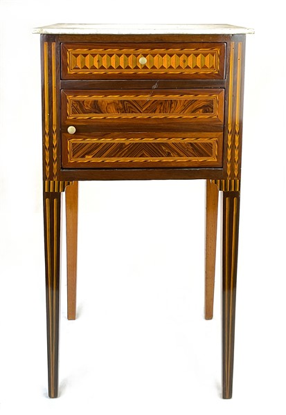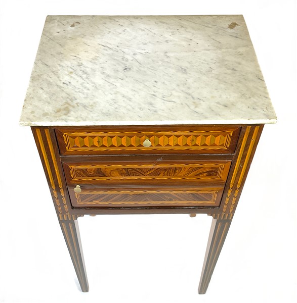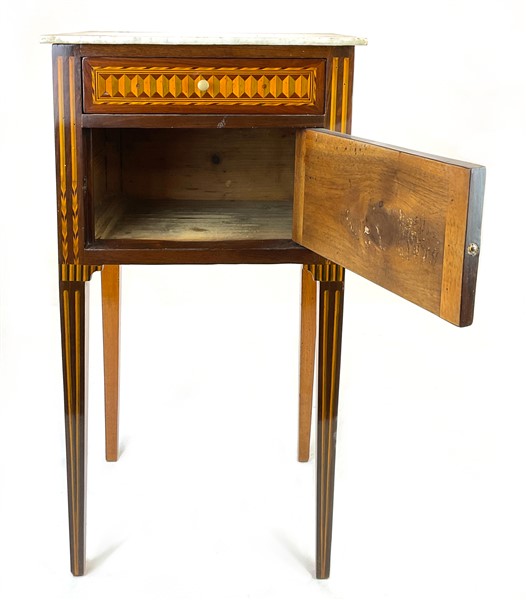 Mobiletto da centro impiallacciato e filettato in legni di varie essenze, fronte a un cassetto e uno sportello, gambe rastremate. Secolo XIX. Piano in marmo incollato d'epoca posteriore (cm 42x77x32) (difetti)
