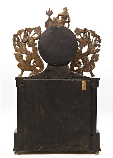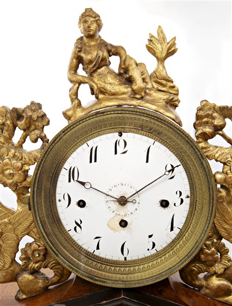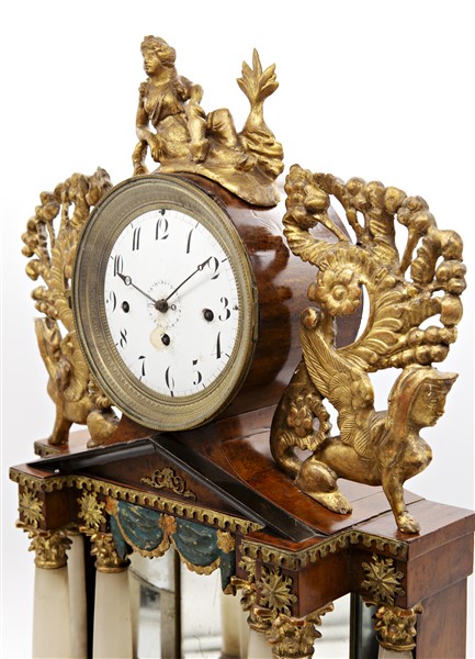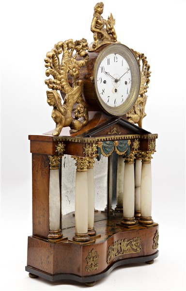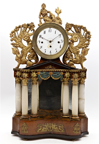 Pendola da appoggio con cassa a portico in legni vari e alabastro decorata da fregi a sfingi.