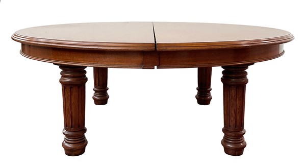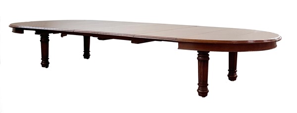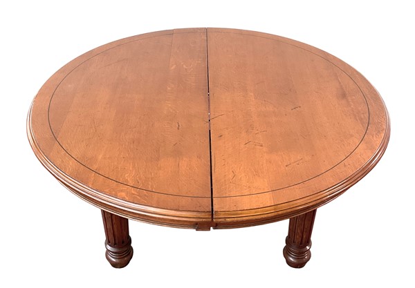 Tavolo allungabile in rovere con piano circolare filettato, gambe scanalate. Inghilterra, secolo XIX (chiuso cm 180x71x184), dotato di cinque allunghi (cm tot 472,5x71x184) (difetti)