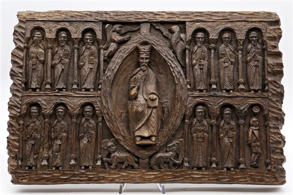 Lot 1208 | Arte spagnola, Cristo (?) in trono entro mandorla e Santi, bassorilievo in legn