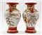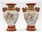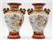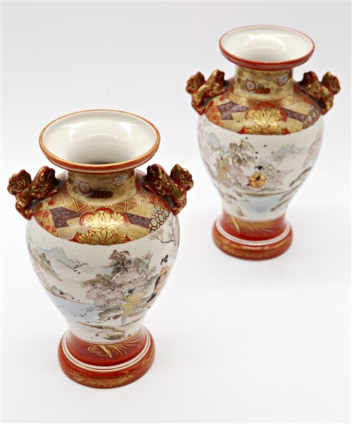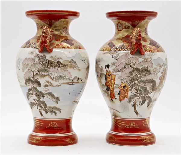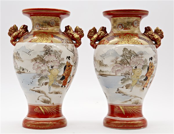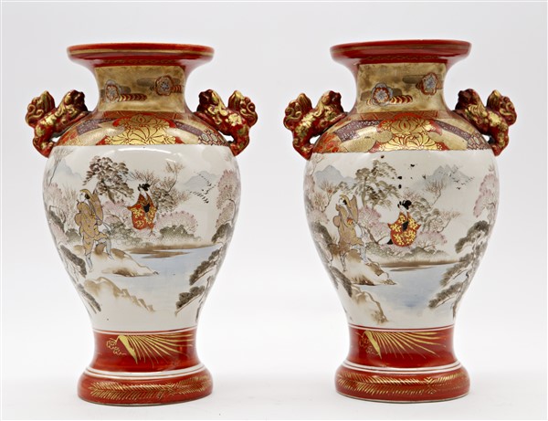 Coppia di vasi in porcellana dipinta in policromia e oro a paesaggi con figure, anse a forma di cani di Pho, marcati sotto la base. Giappone, secolo XX (h cm 24) (lievi difetti)