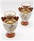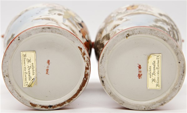 Coppia di vasi in porcellana dipinta in policromia e oro a paesaggi con figure,