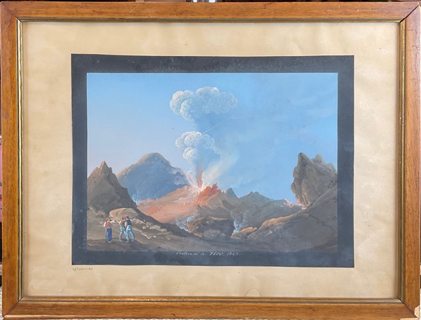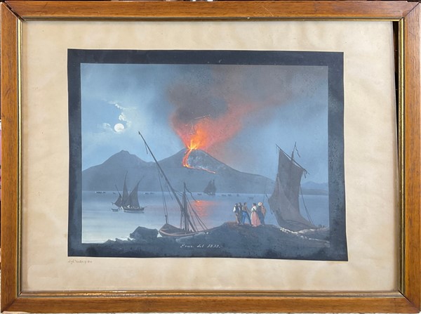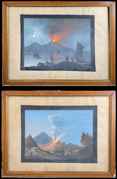 Scuola napoletana, secolo XIX. Due vedute con eruzioni vulcaniche. Gouache su