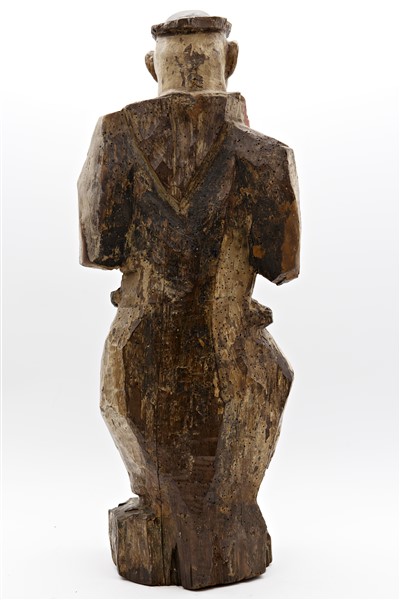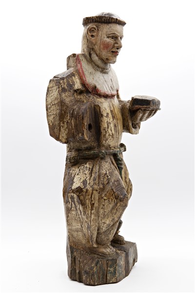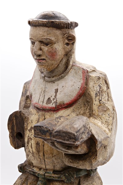 Scultore del secolo XVII, figura di monaco con libro, legno intagliato e laccato in policromia (h cm 62) (difetti e mancanze)