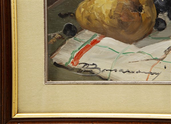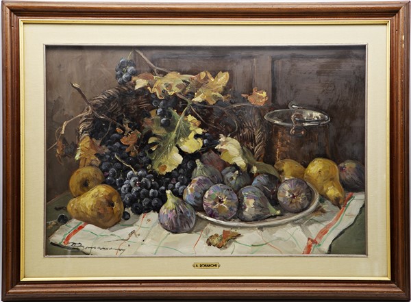 Arturo Bonanomi "Composizione con cesta in vimini, fichi, grappoli d'uva e pere"
