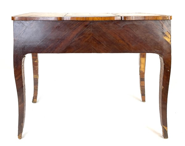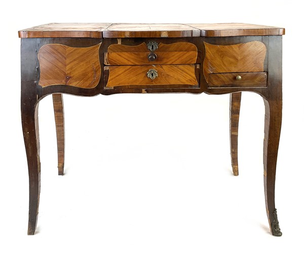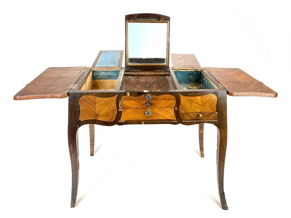 Toilette lastronata e filettata in palissandro e bois de rose con piano tripartito celante specchio, fronte a due diversi cassetti e tiretto con inserto in pelle. Francia, secolo XVIII (cm 81x70x48) (difetti e mancanze)