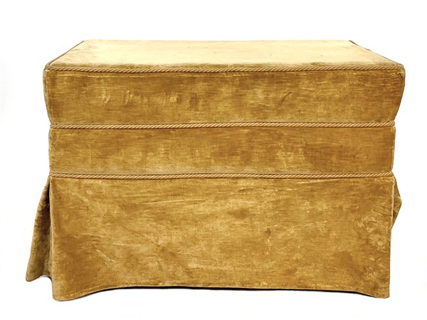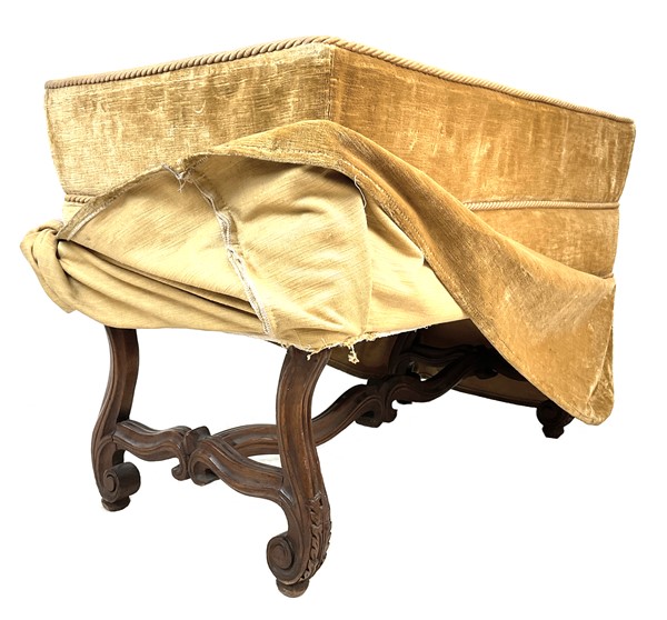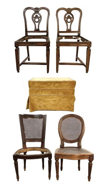 Lotto composto da quattro diverse sedie in legni vari, secolo XVIII. Unite ad un panchetto in stile con struttura in legno rivestito in velluto senape (difetti e mancanze)