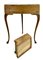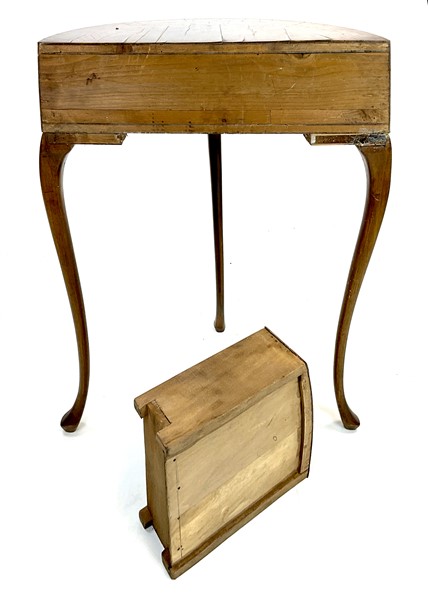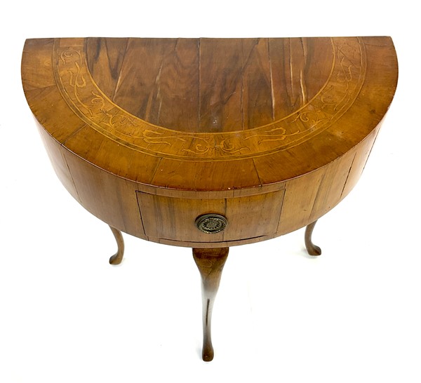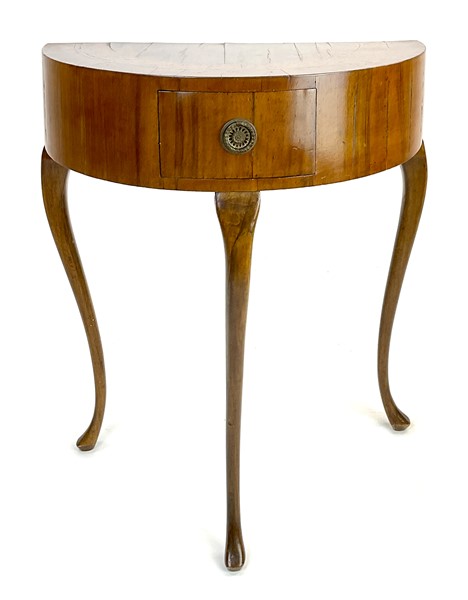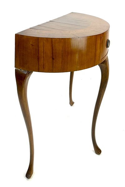 Lot 1270 | Piccola console a mezzaluna con cassetto nella fascia in legni vari e gambe mos