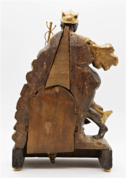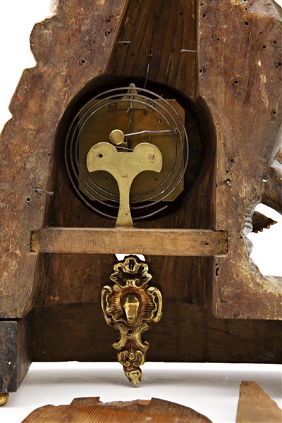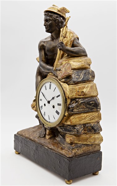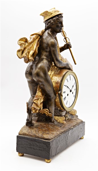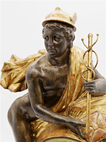 Orologio con automa in legno dorato e dipinto raffigurante Mercurio.