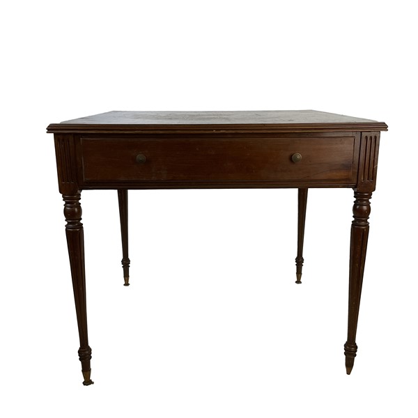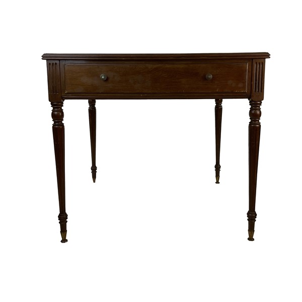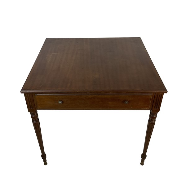 Tavolo in mogano con due cassetti nella fascia, gambe tornite e scanalate. (cm 88x79x84) (difetti e mancanze)