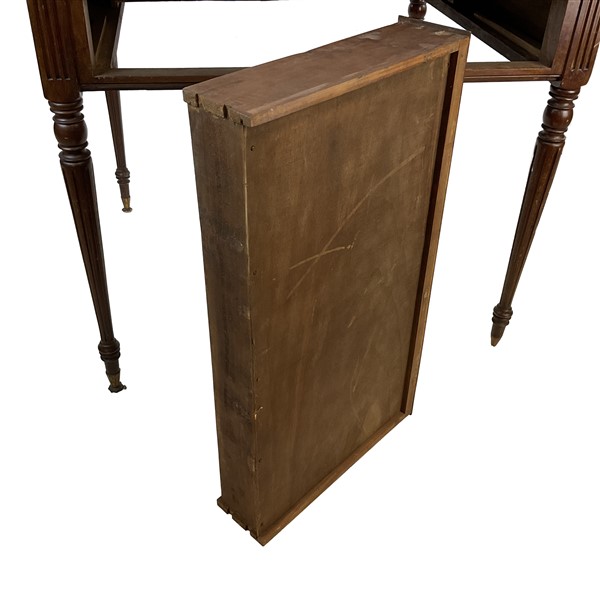 Tavolo in mogano con due cassetti nella fascia, gambe tornite e scanalate. (cm