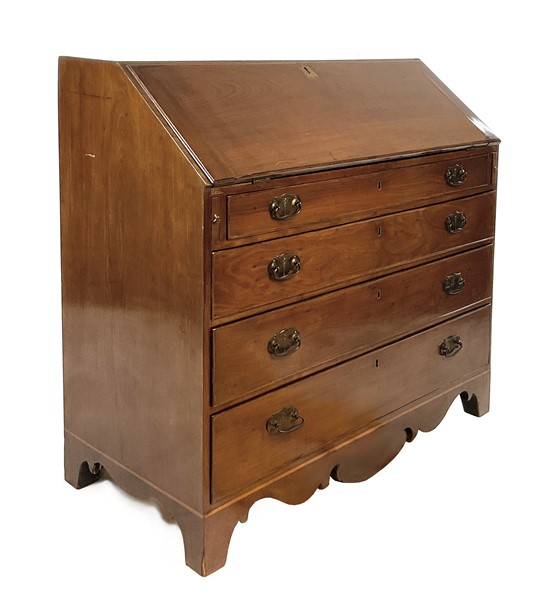 Ribalta in mogano con fronte a quattro cassetti di altezze a scalare, calatoia celante cassettini, vani a giorno e sportello centrale intarsiato, piedi a mensola. Inghilterra, secolo XIX (cm 119x113x55) (difetti)