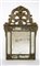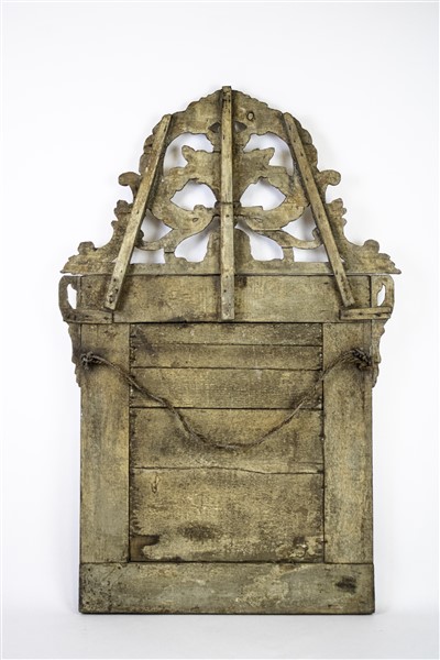 Specchiera in legno intagliato con tracce di doratura a doppio ordine specchiato, cimasa traforata a vaso fiorito e volute. Fine secolo XVIII (cm 93x60) (difetti e restauri)