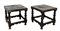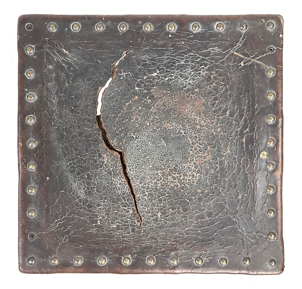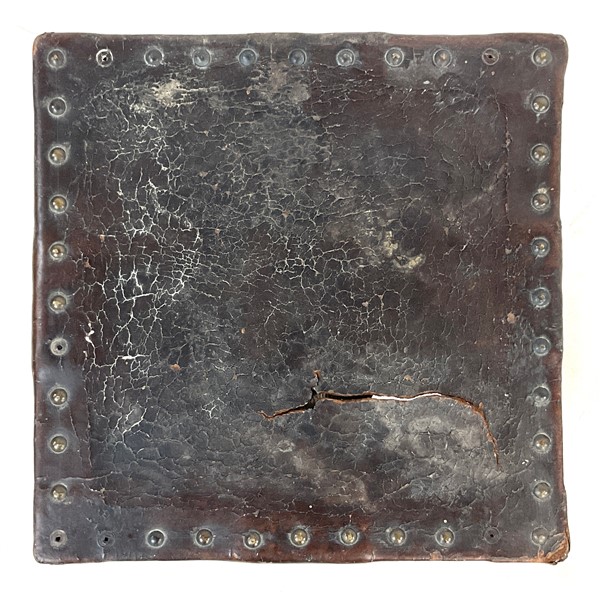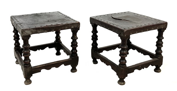Coppia di antichi sgabelli con gambe in legno tornito a rocchetto riunite da traverse di raccordo, seduta in cuoio borchiato. (cm 35x34x35) (gravi difetti)