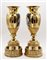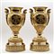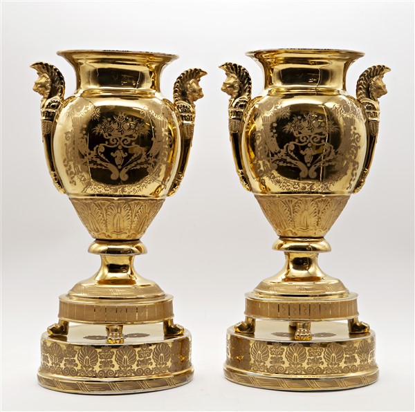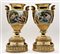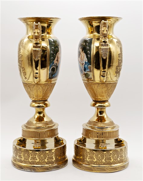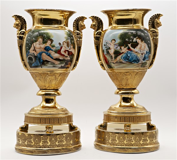 Coppia di vasi biansati in porcellana con basi ovali, decorati sul fronte in policromia con scene allegoriche su fondo oro, piedi ferini (h tot cm 45,5) (difetti)