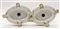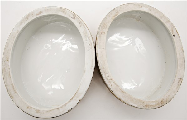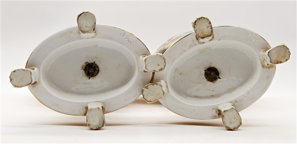 Coppia di vasi biansati in porcellana con basi ovali, decorati sul fronte in po