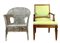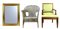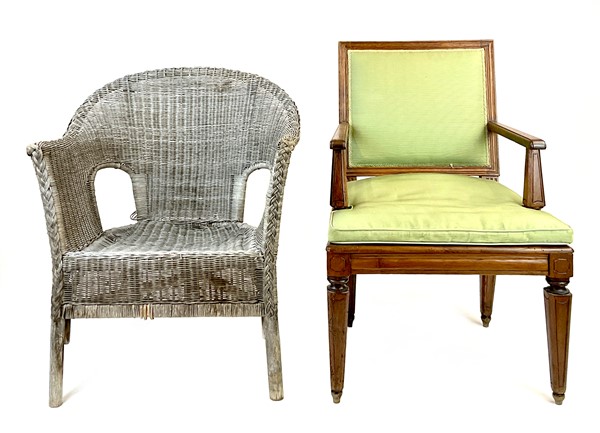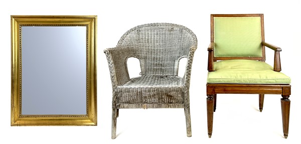 Lotto composto da un'antica poltrona in noce con gambe a obelisco rovesciato, una poltrona in midollino e manao scortecciato e una specchiera con cornice dorata (specchiera cm 77x60) (difetti)