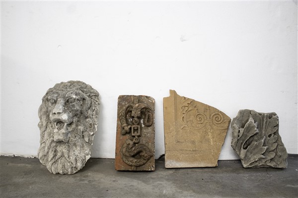 Lotto composto da un mascherone a testa leonina, due frammenti di fregio in ter