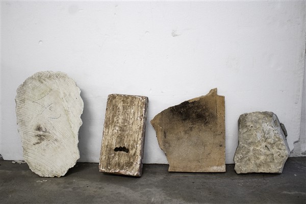 Lotto composto da un mascherone a testa leonina, due frammenti di fregio in terracotta e uno in marmo a motivi diversi (cm max 51x33) (difetti e mancanze)