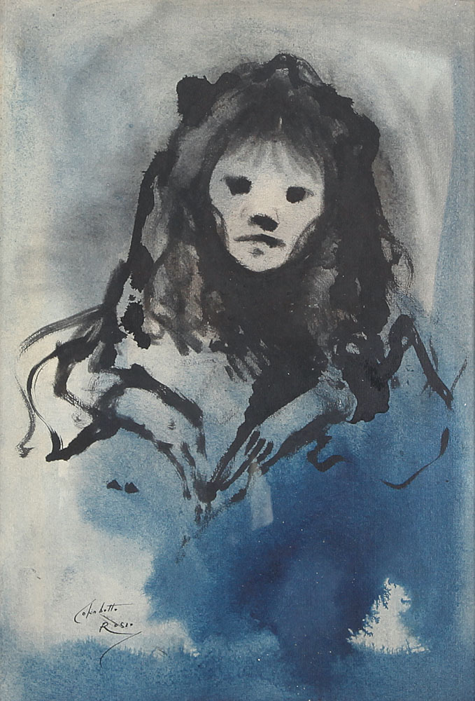 china e acquerello su carta intelata cm. 50x35, firma in basso a sinistra, firma e tecnica al retro, dichiarazione d'autenticità e provenienza della Sant'Agostino (TO) su foto.