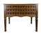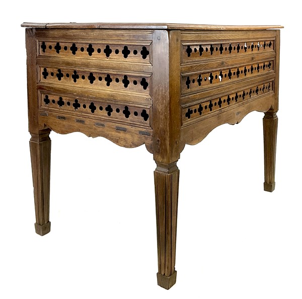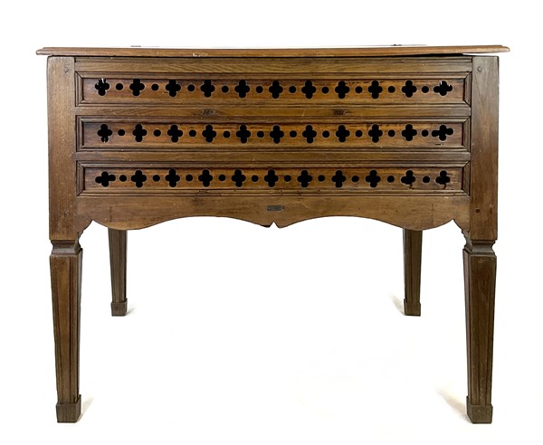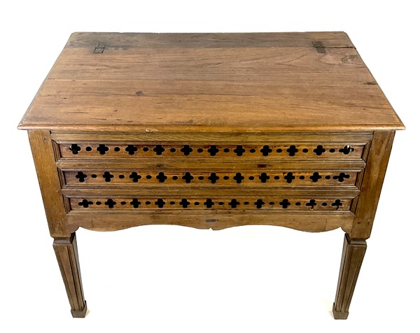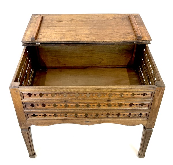Mobile contenitore in legni vari con piano ribaltabile, fronte e fianchi con pannellature traforate, gambe scanalate (cm 98x79x63) (difetti, restauri e sostituzioni)