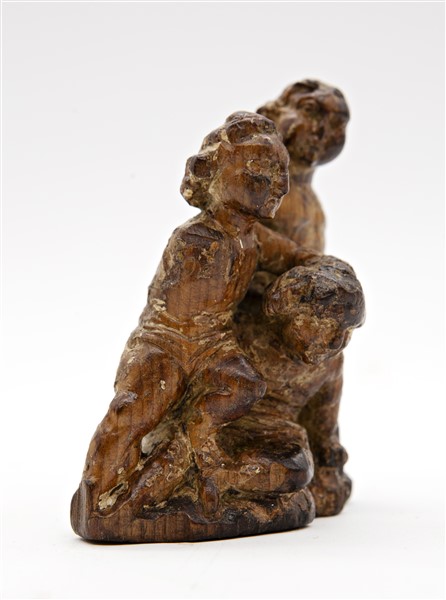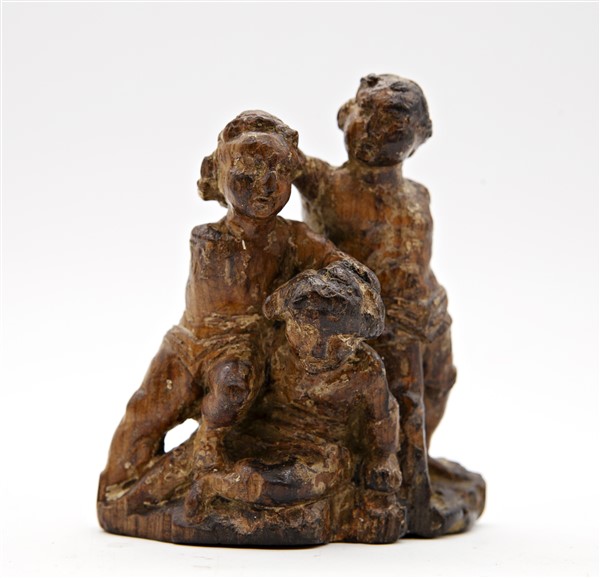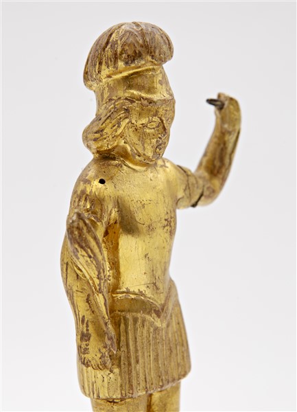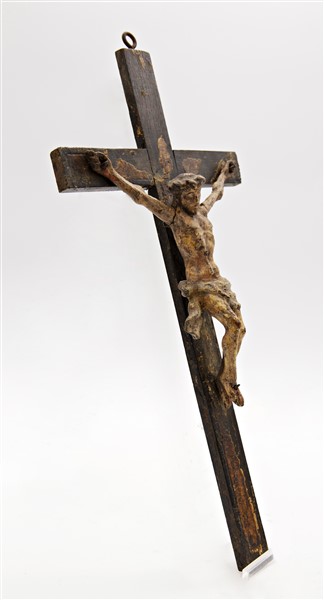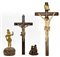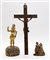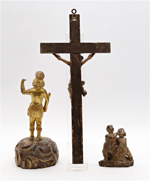 Arte del secolo XIX. Lotto composto da due Crocifissi in legno e cartapesta dipinta, una figura di santo martire in legno dorato e un piccolo gruppo di putti in legno intagliato (h max cm 86) (difetti e mancanze)