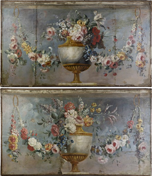 Lot 1367 | Scuola veneta del secolo XIX "Vasi e festoni di fiori" olio su carta applicata