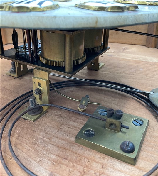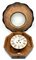 Orologio da parete del tipo "occhio di bue" con cassa in legni vari e decori metallici. Quadrante in alabastro con cartouches in smalto bianco a numeri romani. Lancette del tipo "Breguet". Movimento a due treni con suoneria delle ore e mezze su gong (d. cm 50) (difetti e restauri)