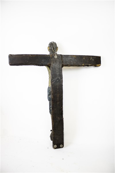 Arte spagnola del secolo XVII. Cristo Crocefisso in legno intagliato e dipinto, su croce lignea di epoca successiva (cm tot 94x80) (difetti e restauri)