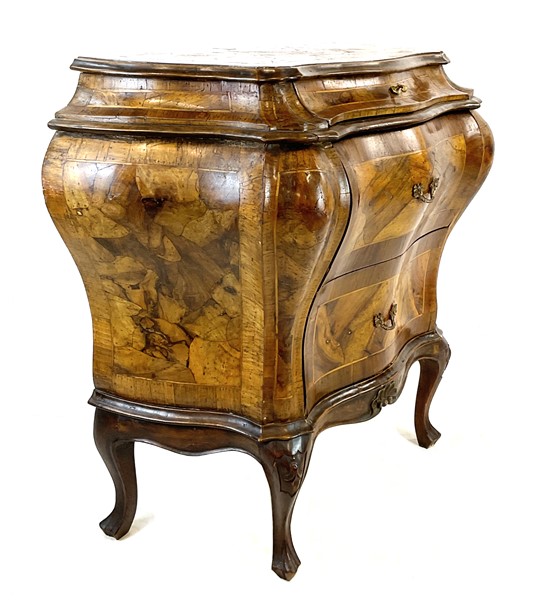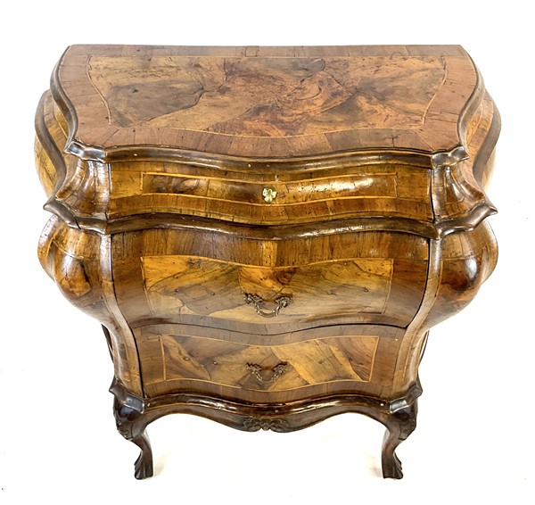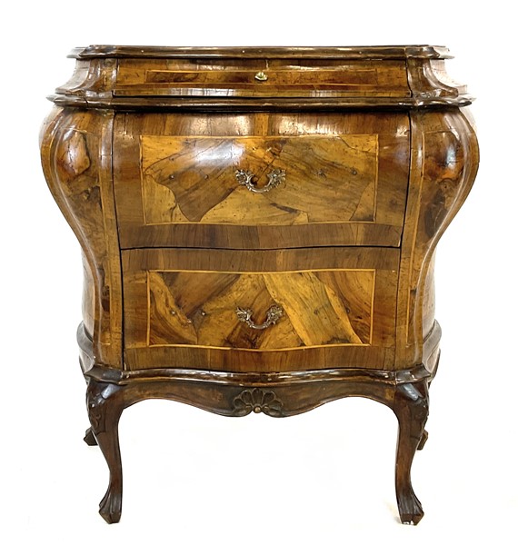 Lot 1380 | Piccolo comò bombato veneto lastronato in noce, radica di noce e filettato. Fro