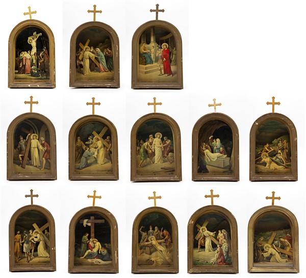 Gruppo di tredici diorami raffiguranti le stazioni della Via Crucis con teche i